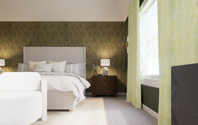 Our design balanced the room’s grand proportions with layered textures and an earthy palette of greens and warm cognac. A custom velvet bed, hand-loomed rug, and sculptural seating anchor the space, while espresso-finished furnishings and a curated bookshelf bring both order and soul. The result is a gently cocooned refuge—warm, calm, and restorative—where rest feels natural and renewal effortless.